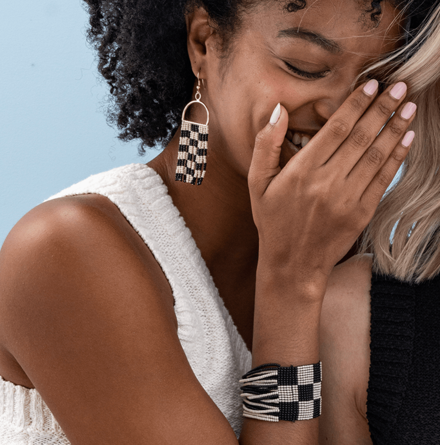 Check it out! Our new hand-beaded earrings are taking the internet by storm. With their flowy fringe and trendy checkered pattern, these lightweight statement earrings will soon become your jewelry box go-tos.