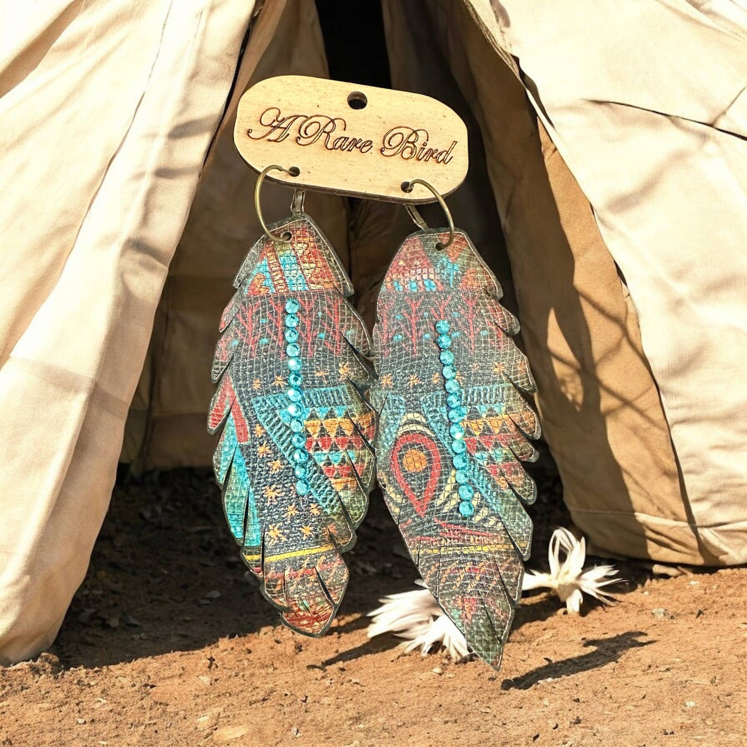 Aztec printed leather, hand cut earrings. The feathers are distressed and sparkled. Perfect for any outfit.