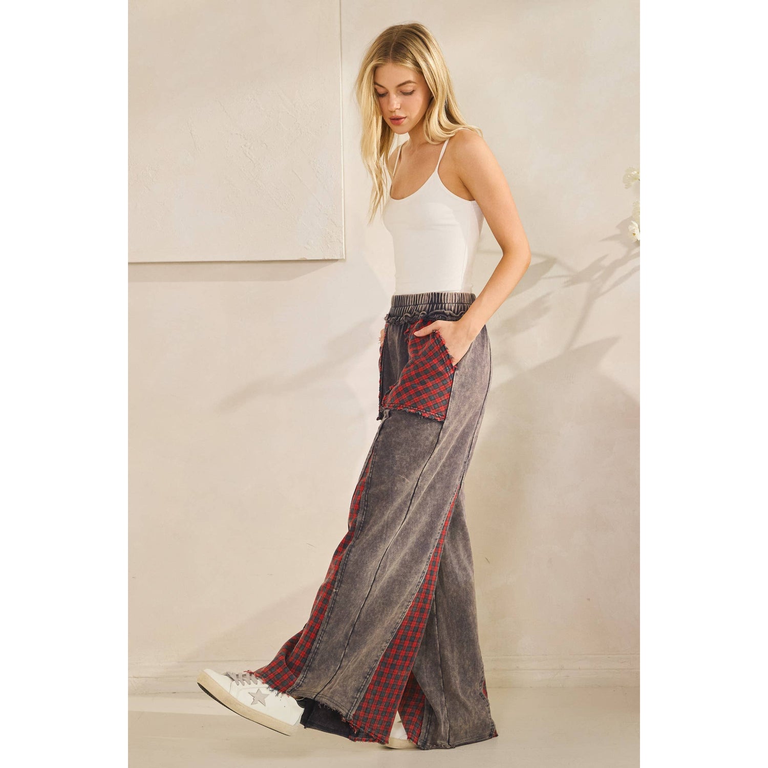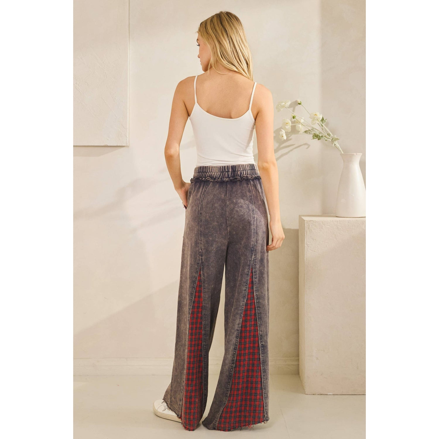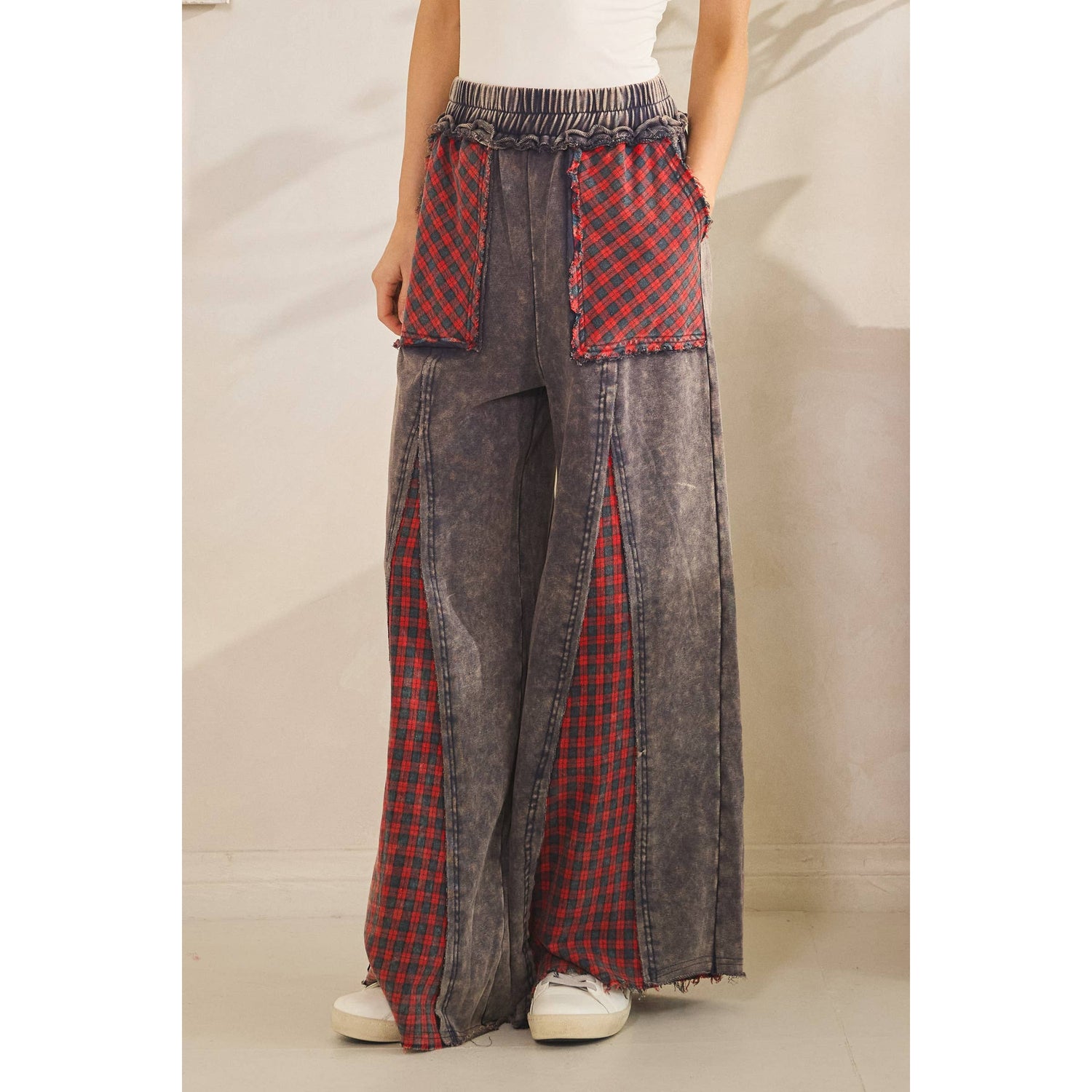 Designed in a mineral-washed knit, these bold bottoms feature raw-edge patch pockets and contrast red check plaid inserts down the legs for a true statement look. Finished with an elastic waistband, drawstring tie, and exaggerated wide leg silhouette.