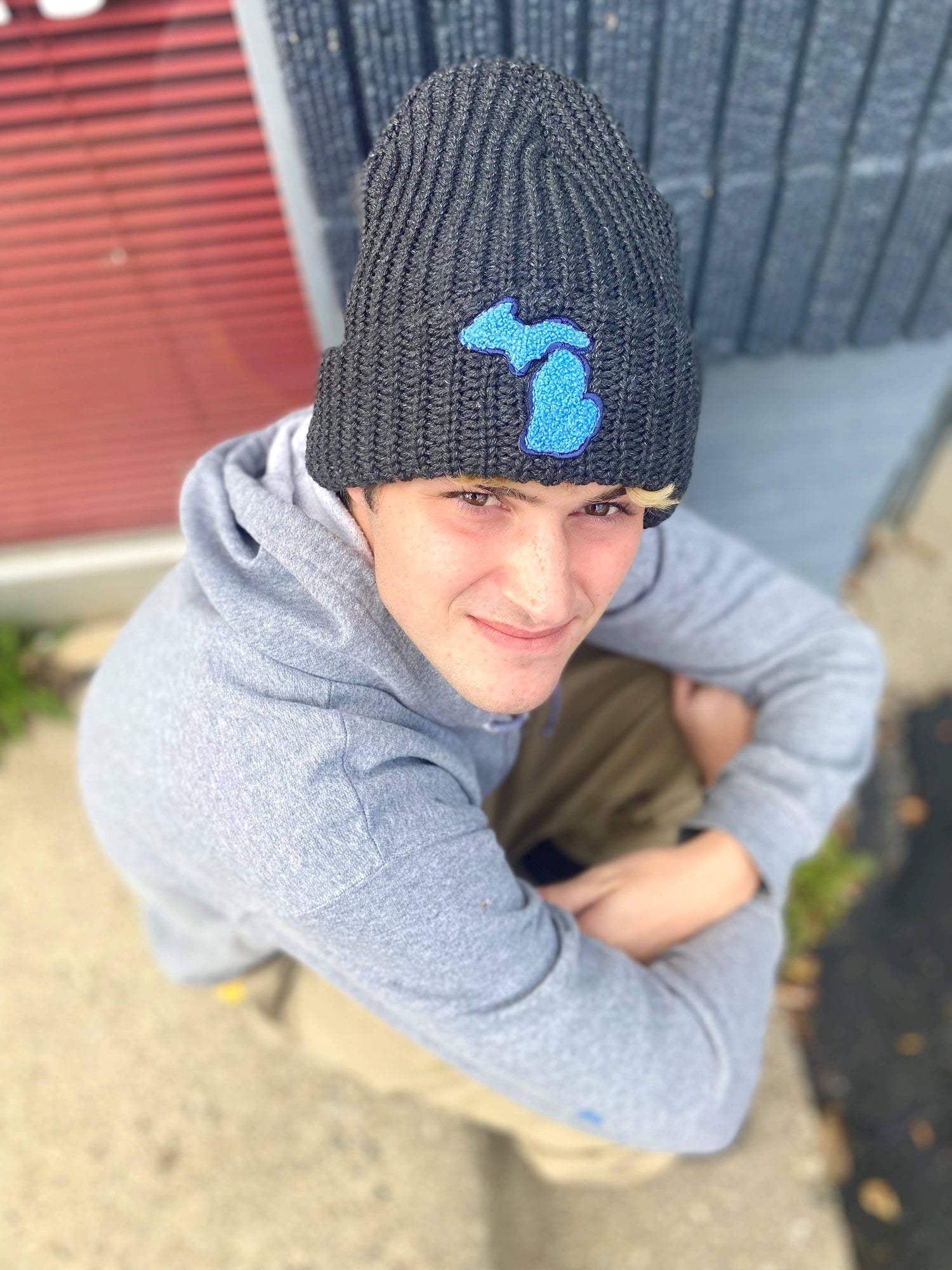 12" Chunky knit cuff Toque (knit cap) in charcoal, featuring our signature chenille Michigan patch sewn-on. Available in three patch colors. Oh so soft & warm. 100% Acrylic.