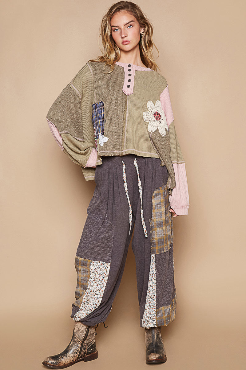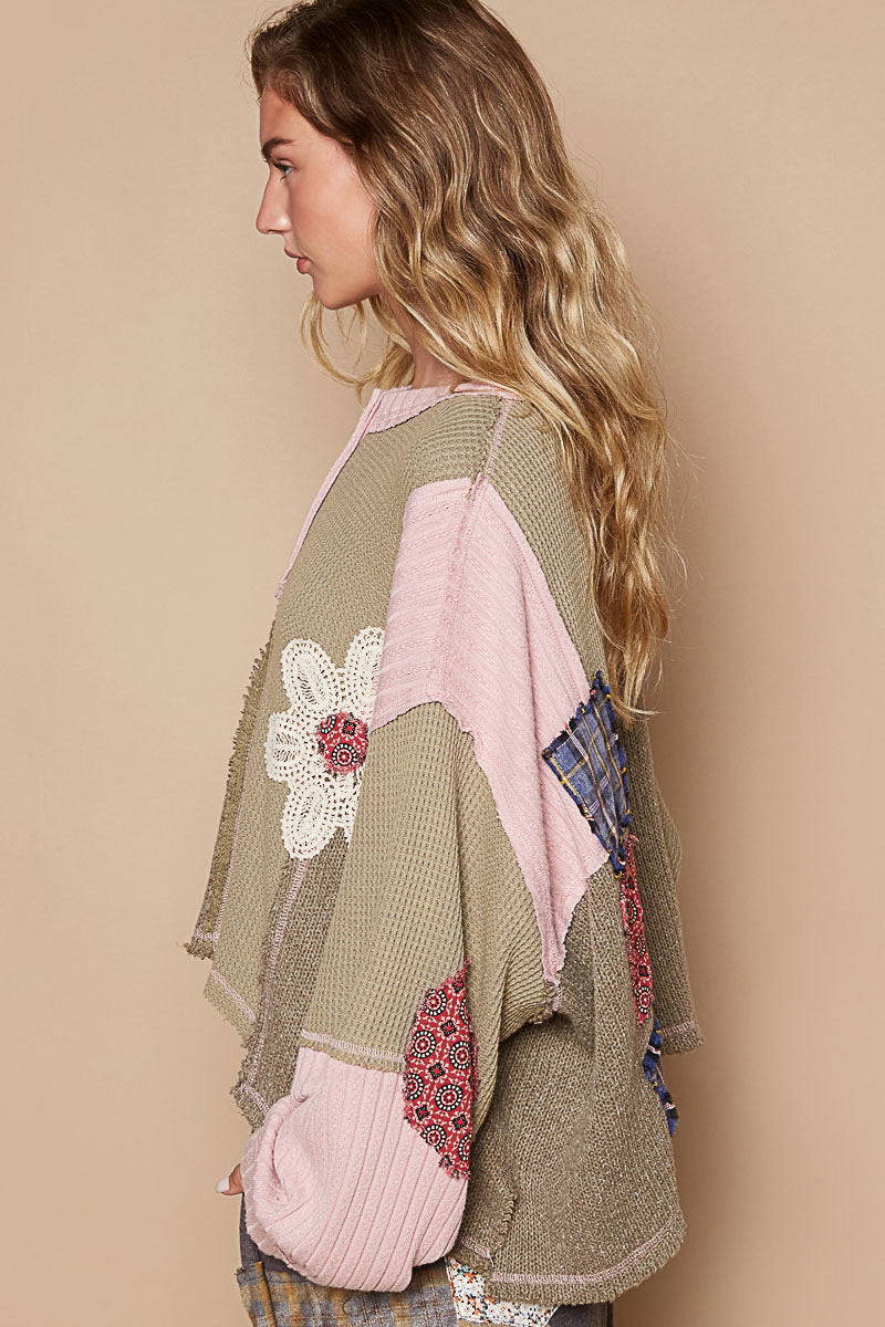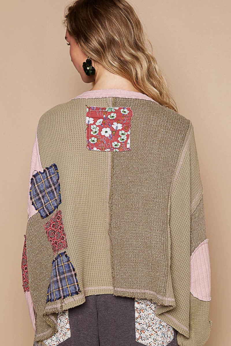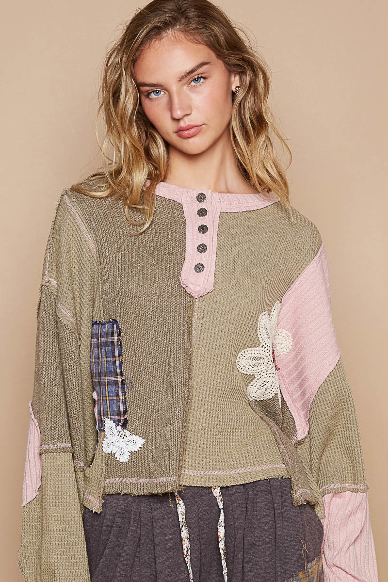 Designed in round neck with placket, balloon sleeve, oversized fit top in thermal and cut and sew knit mix with patch detail pointed solid pattern.