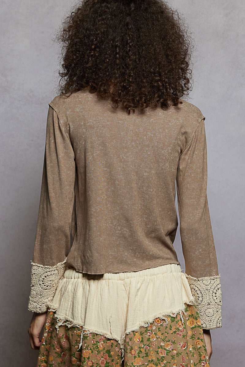 Designed in round neck long sleeve slim fit top in cotton jersey with crochet on top patch, outseam, half placket with metal buttons, merrow edge detai vintade washina, solid color.